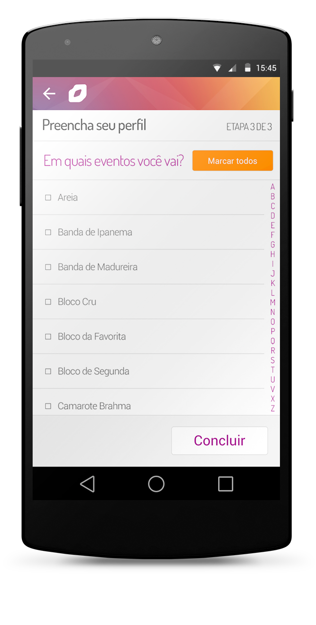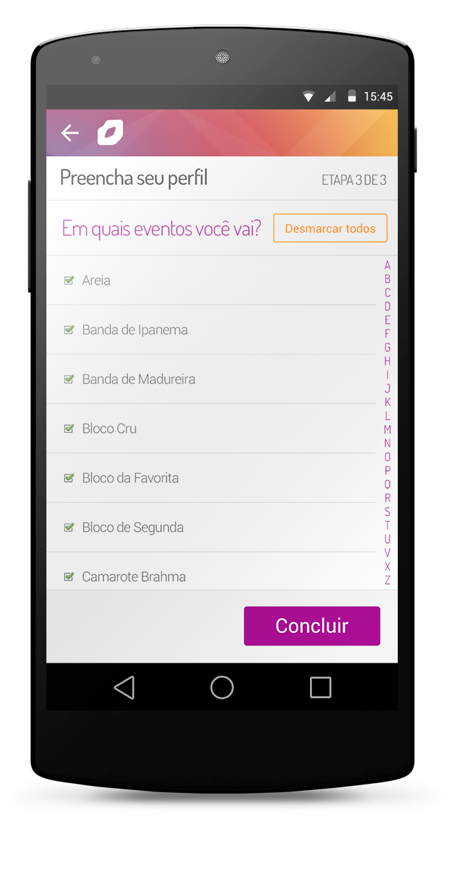Já que a idéia era usar as soluções proprietárias que já tinham aceitação no mercado e somá-las ao apelo do carnaval, a arquitetura da informação, os fluxos de navegação e as interações já estavam definidas em quase todo o app, exceto a seleção de eventos. Por isso desenhamos wireframes e fluxo.