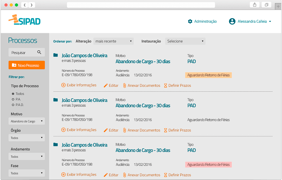 - A ordenação dos processos na lista poderia ser feita não apenas pela data de alteração, mas pela data de instauração do processo.